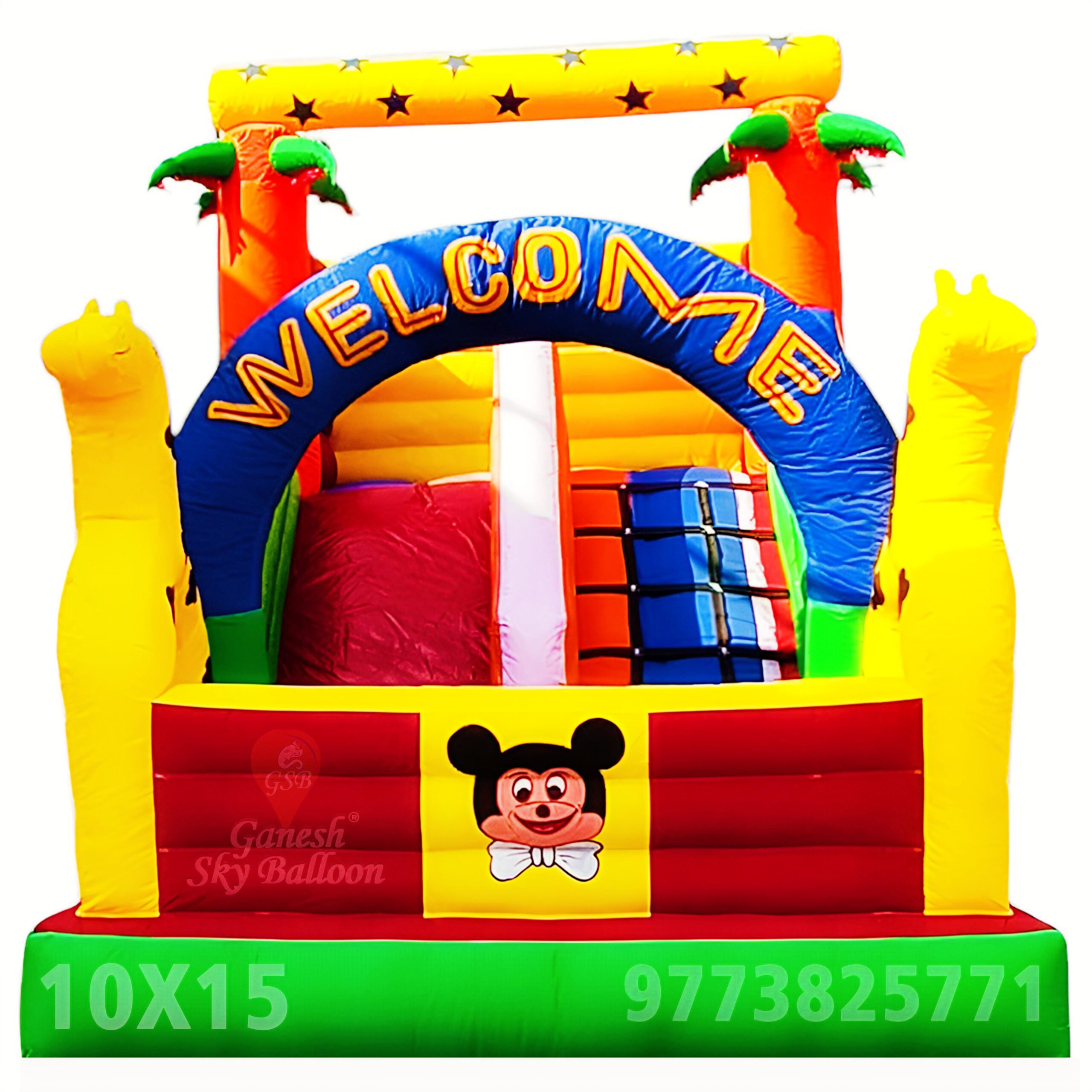 The 10×15 Mickey Mouse jumping bouncy is a vibrant and colorful inflatable play structure designed for children’s entertainment. It is constructed from durable and high-quality materials, ensuring a safe and enjoyable experience.